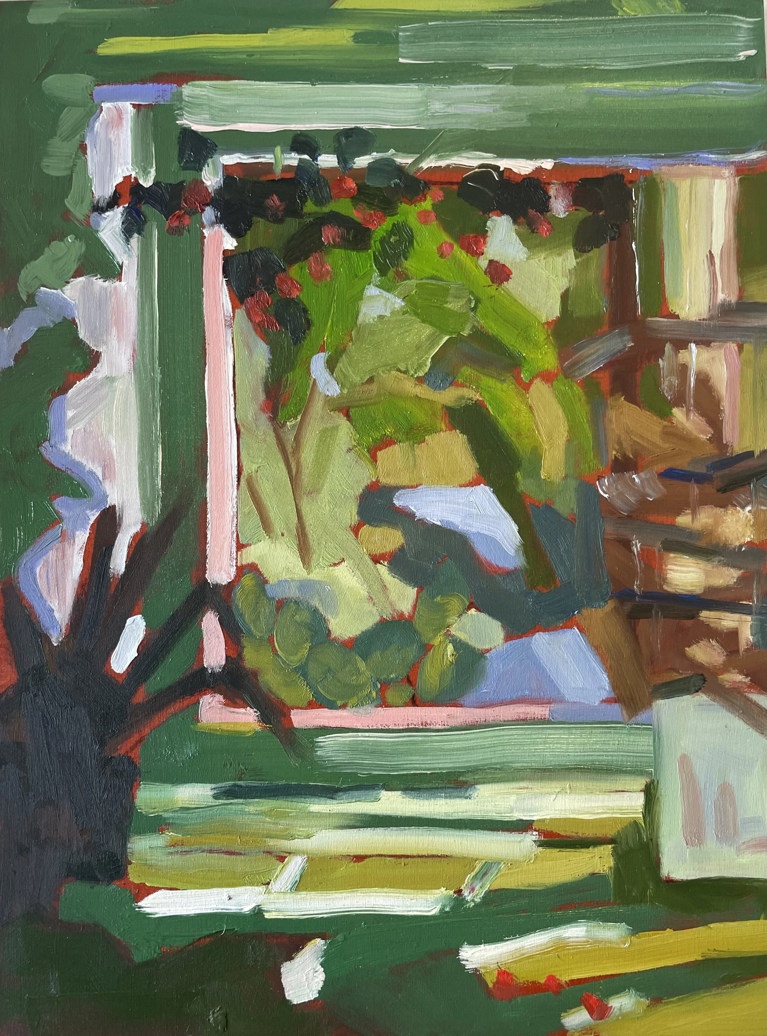 on the terrace, gardens and old boats, oil on board, 30 x 23cm, private collection